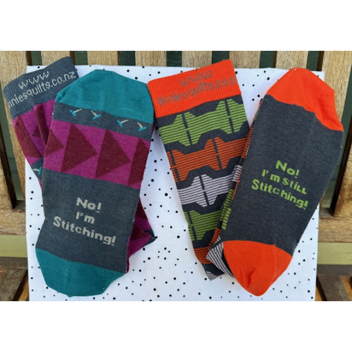 We are launching Vol.2 of our Annie's Stitching socks! Out newest pair features our favourite saying, with a version two twist "No, I'm still stitching!" with awesome grey base and green, silver and orange cotton reels wrapping from toe to calf!