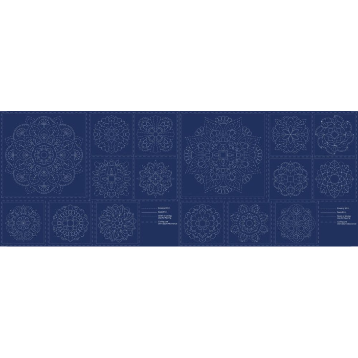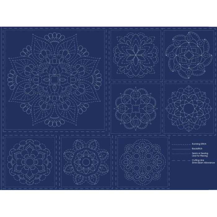 This stunninng mandala themed modern sashiko panel features 2 x Large feature blocks 12″ and 14 x Small accompanying blocks 6″, giving you a wide range of arrangments for cushions, table runners, quilt top, coasters and many more!