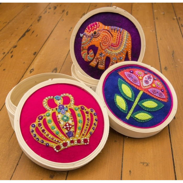 Featuring wool applique, these little bowls make excellent sewing baskets using inexpensive steamer bowls from Asian food shops.