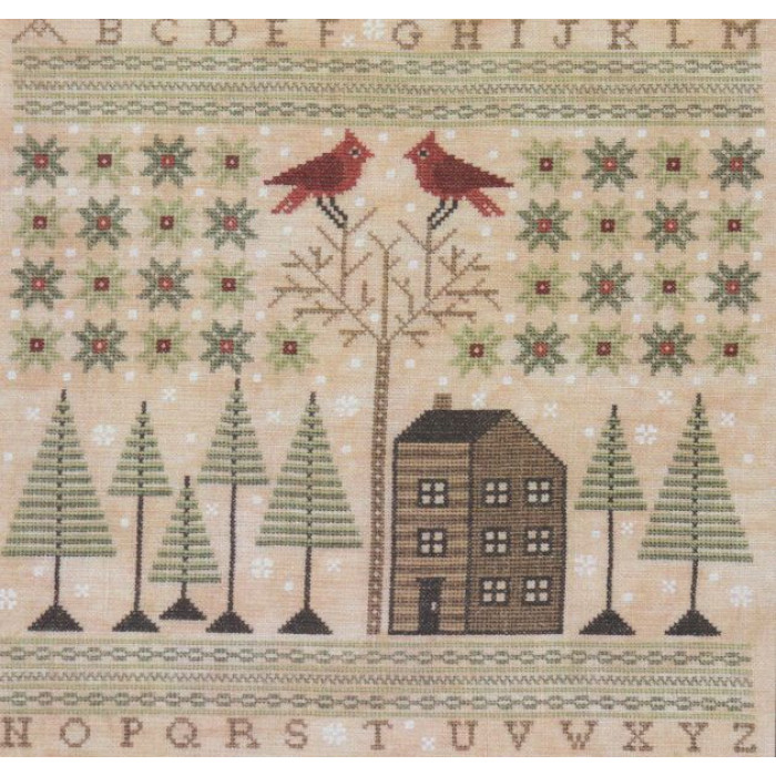 This darling design evokes the charm and warmth of a cozy winter sweater The mottled linen background embraces a tiny forest of evergreens, stylized flowers and a mixed-border pattern for a vintage wintry feeling. A humble prim house is nestled below the bare branches of a stately hardwood tree, proving the perfect perch for a pair of red-bird cardinals. Softly falling snow and a proper uppercase alphabet complete this simple sampler that is sure to become a favorite winter decoration!