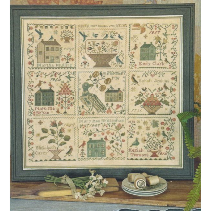 Cross stitch pattern from Blackbird Designs featuring a lovely sampler in nine parts, with houses, flowers, birds, and more!