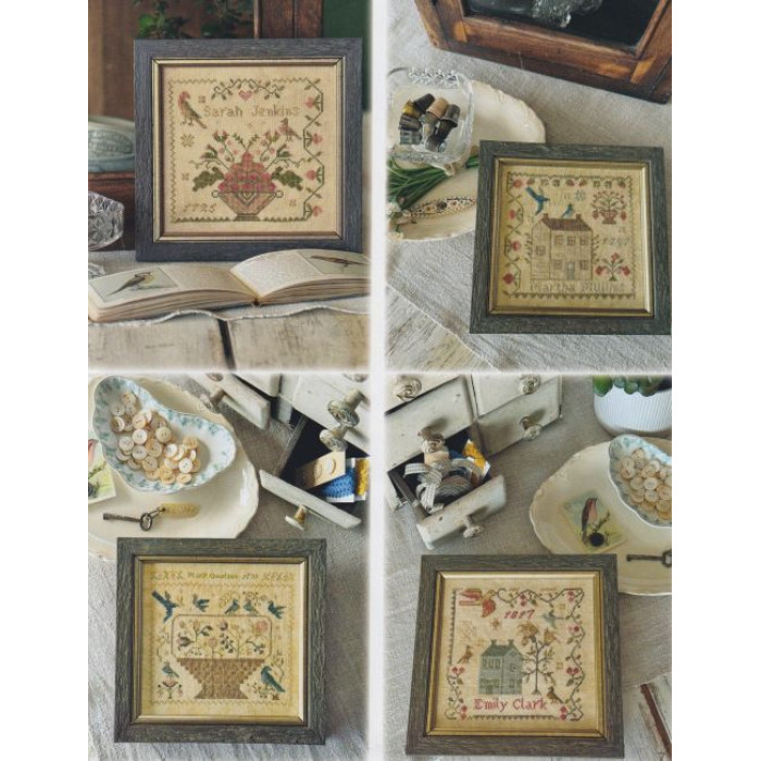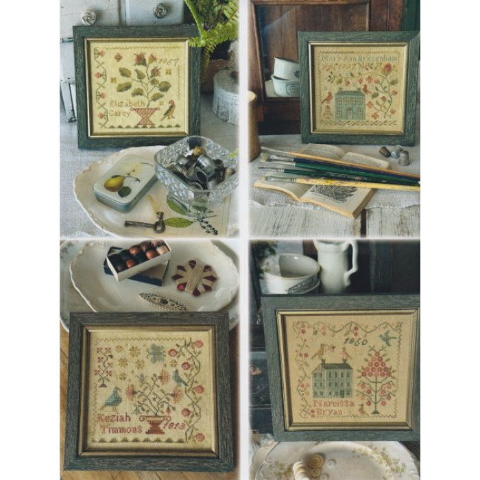 Includes 9 separate samplers, which can be stitched together or individually. Patterns are stitched on 36 ct Heartland from Picture This Plus and 36 ct Parchment from Fiber on a Whim. Patterns use Weeks Dye Works, Classic Colorworks, Gentle Arts, and Valdani threads(DMC conversion listed for Valdani Roasted Orange). Stitch count is 101 x 95 each. Finished size is 5 5/8" x 5 3/8" each.