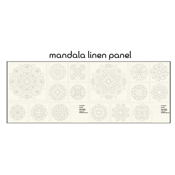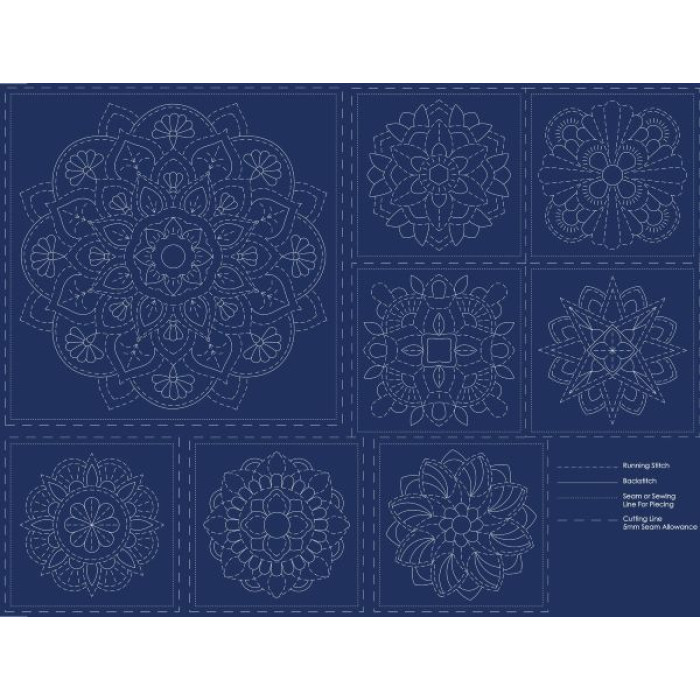 This stunninng mandala themed modern sashiko panel features 2 x Large feature blocks 12″ and 14 x Small accompanying blocks 6″, giving you a wide range of arrangments for cushions, table runners, quilt top, coasters and many more!